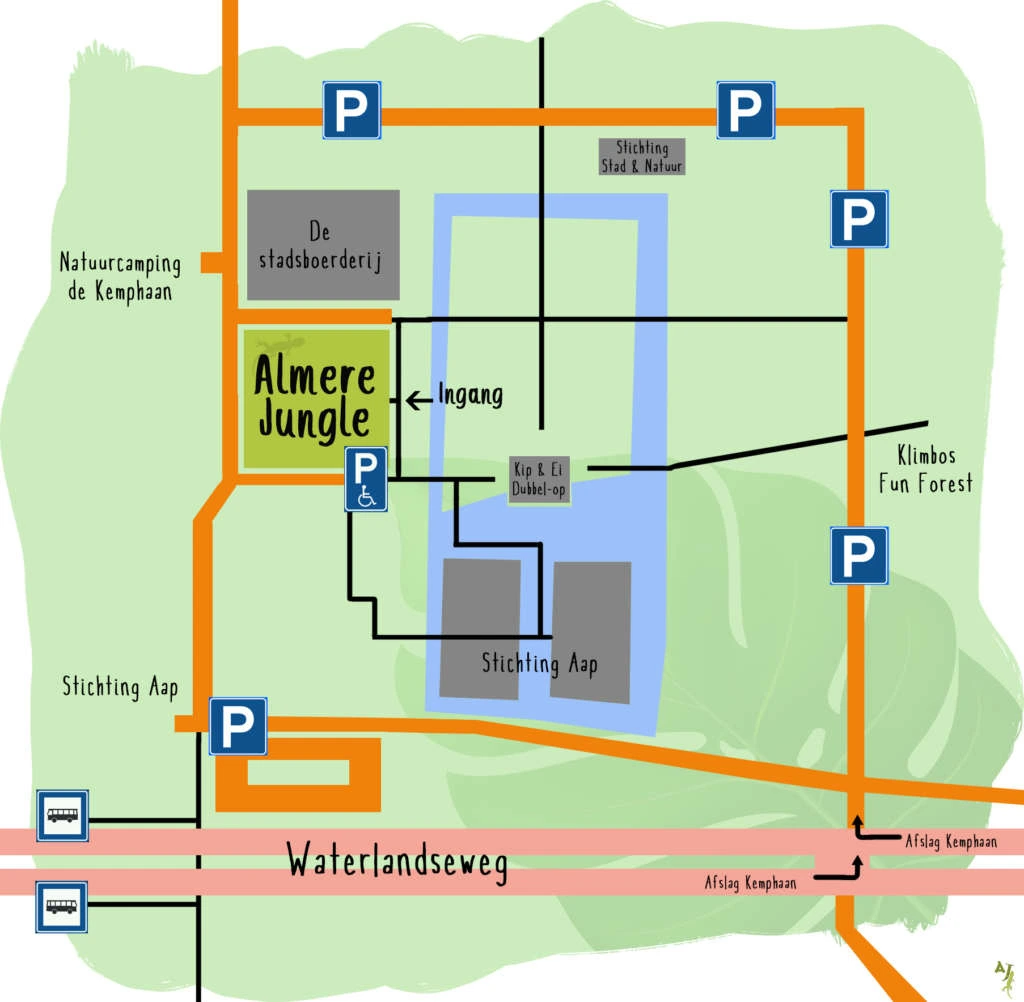 Welkom bij Almere Jungle — jouw groene ontsnapping in Almere! Op deze pagina vind je alle praktische informatie om zonder zorgen bij ons aan te komen. Of je nu met de auto, fiets of het openbaar vervoer komt: we vertellen je precies welke route je kunt nemen, waar je je auto neerzet en hoe je het laatste stuk naar de ingang gemakkelijk aflegt. Zo begint je jungle-avontuur ontspannen en goed voorbereid.